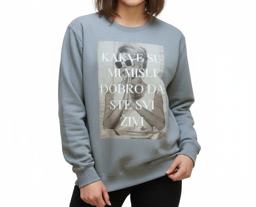 Majica “Kakve su mi misli dobro da ste svi živi” dostupno u sivoj boji veličina L.