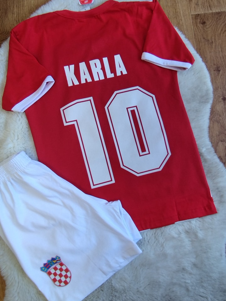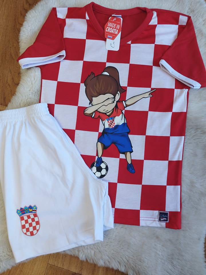 Komplet “Hrvatska girl” sa imenom i brojem po želji, pamučni komplet dostupan sa hlačama u bijeloj, crvenoj i plavoj boji. Željeno ime i broj upisati u “Napomene uz narudžbe” na stranici Plaćanja.