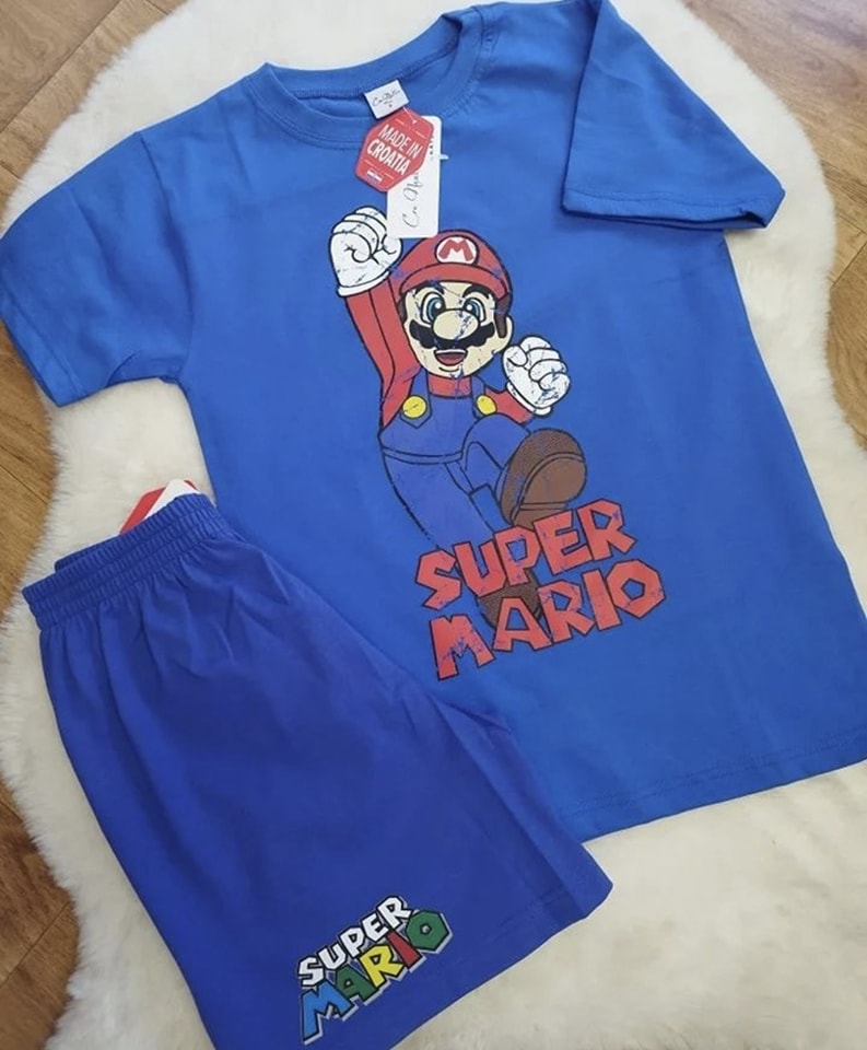 Komplet “Super Mario” dostupan je sa plavim hlačama i majicama u više boja, hrvatska proizvodnja.