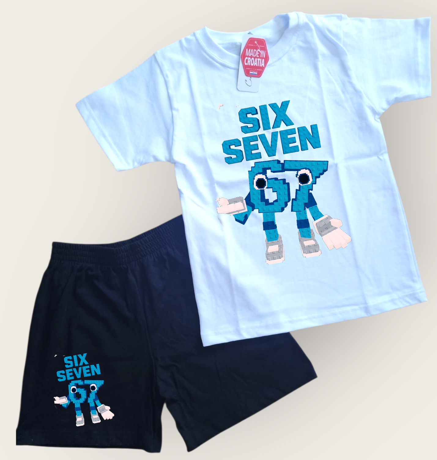 Komplet “Six Seven” dostupan sa crnim hlačama i majicom u više boja.