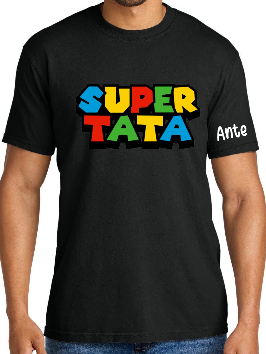 Majica “Super tata” -personalizirana, sa imenom po želji na rukavu, dostupno u više boja i veličina. Željeno ime upisati u “Napomene uz narudžbe” na stranici Plaćanja.